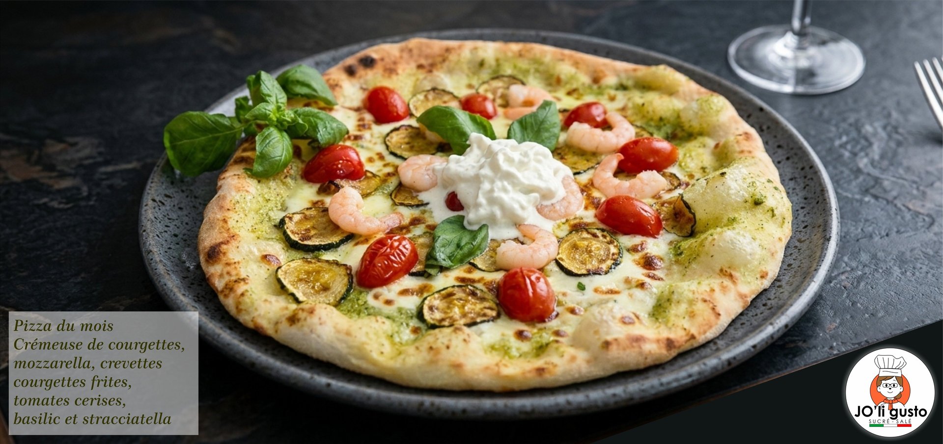 Sauce au pesto basilic, mozzarella fior di latte, jambon cru italien, tomates séché, chèvre, pignons de pin