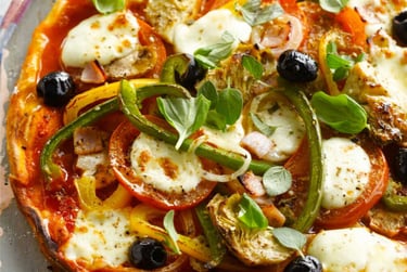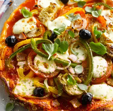 Tomate fraîche, mozzarella fior di latte, jambon blanc, champignons, artichauts, poivrons