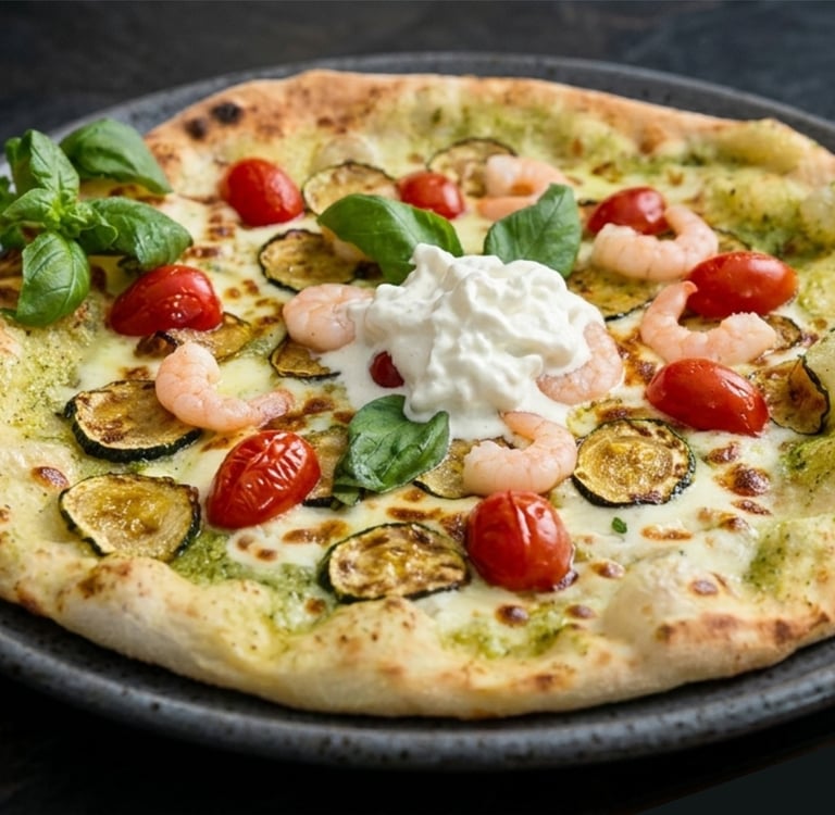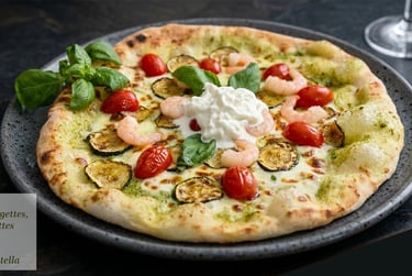 Crémeuse de courgettes, mozzarella, crevettes courgettes frites, tomates cerises, basilic et stracciatella