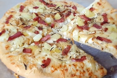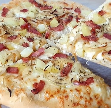 Base Crème fraîche, mozzarella fior di latte, fromage à tartiflette, pomme de terre, lardons fumé, oignons