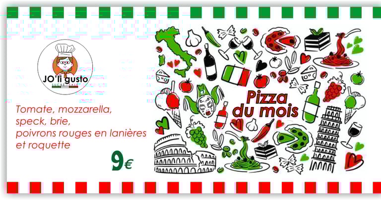 Chaque mercredi et samedis soirs, entre 18h00 et 20h00, nous préparons les pizzas. Les commandes peuvent être envoyées par SMS, e-mail et sur www.joligusto.fr en précisant: votre nom, le type et la quantité de pizzas ou dessert et l'heure à laquelle vous souhaitez venir les chercher.